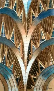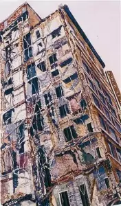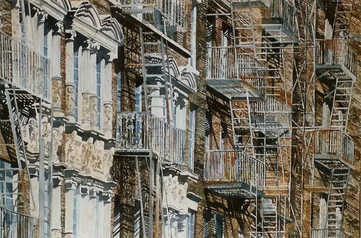 Sandra Walker, R. I. is an adherent of the American photo-realist school of Richard Estes and Chuck Close. She makes paintings that are informed by photography and photographs. In the tradition of Canaletto, Utrillo and Hopper, she prefers the cityscape, somewhat abhorring, she says, “too much green” – which is saying something, since for about the last twenty years she has lived in a leafy Buckinghamshire village. But contrary to the easy assumption one may bring to a survey of her watercolours, they are not transcribed photographs or simply crafted repetitions of scenes viewed with the naked eye.