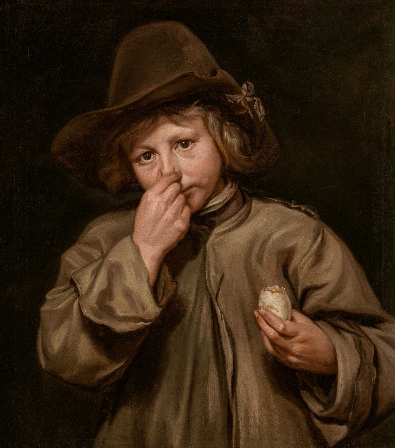 Then there comes a great recent discovery: a group of five paintings depicting the five senses. These were thought to be lost until they resurfaced in 2019 and are shown here publicly for the first time. Her subjects again are children and her approach is one of sensitivity tinged with humour. For Touch a young lad has cut his finger; for Taste the food is a dull piece of toast; and for Smell her subject is assaulted by the odor of a rotten egg.
